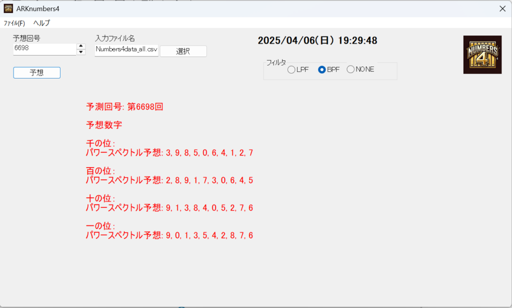 - 予測結果の表示: 予測ボタンを押すと、パワースペクトルに基づいて次回の当選確率の高い番号を表示します。最も可能性が高い数字から順にリストアップされます。