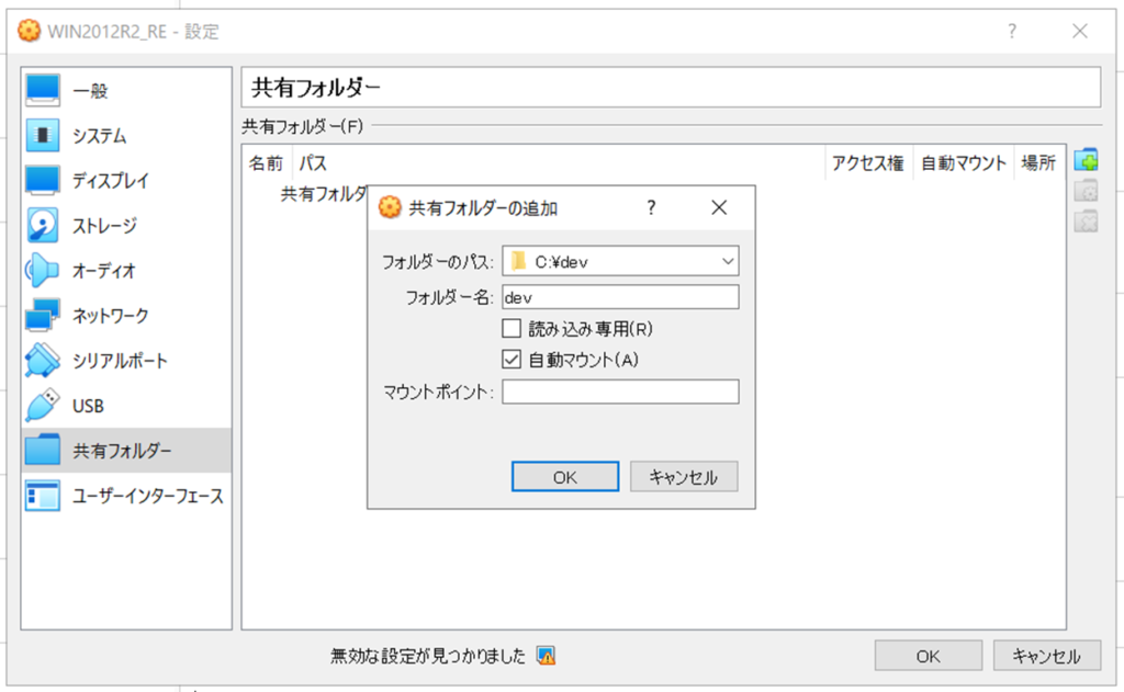 VirtualBoxの共有フォルダの設定 Server X Facebook はてブ Pocket LINE コピー 2022.03.292023.09.28 アフィリエイト広告を利用しています visualboxの共有フォルダ設定についていつも忘れるので手順化してみた。 目次 Guest Additions(ホストOSとゲストOS間の統合)のインストール共有フォルダ設定(ホストOS上にゲストOSがマウントできるフォルダを作成し、双方のOS間でのファイルのやり取りが可能) Guest Additions(ホストOSとゲストOS間の統合)のインストール 共有フォルダ設定(ホストOS上にゲストOSがマウントできるフォルダを作成し、双方のOS間でのファイルのやり取りが可能)