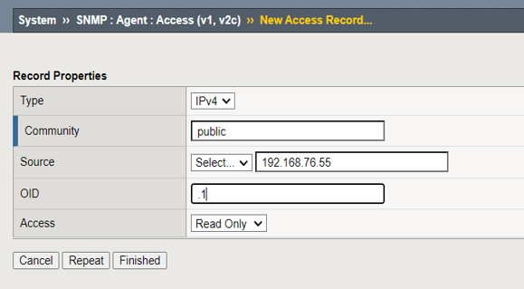 「System」 ⇒ 「SNMP」 ⇒ 「Agent」 ⇒ 「Access(v1, v2c)」の画面で設定を行う。