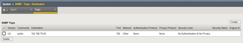 「System」⇒「SNMP」⇒「Traps」⇒「Destination」で設定を行う。