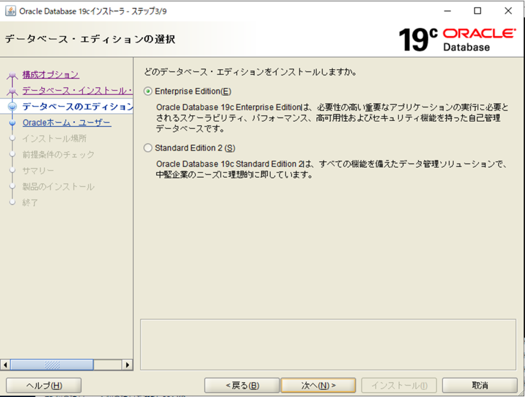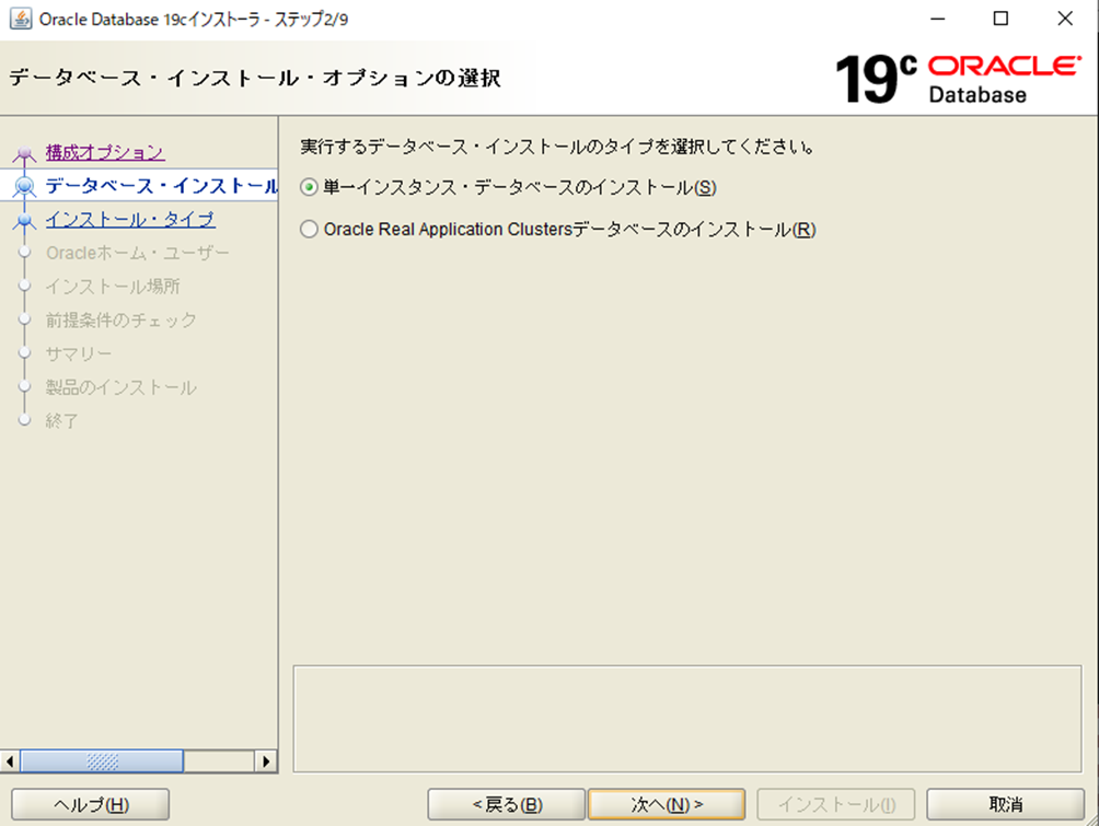 クラスタ構成ではなく、「単一インスタンス・データベースのインストール」を選択します。