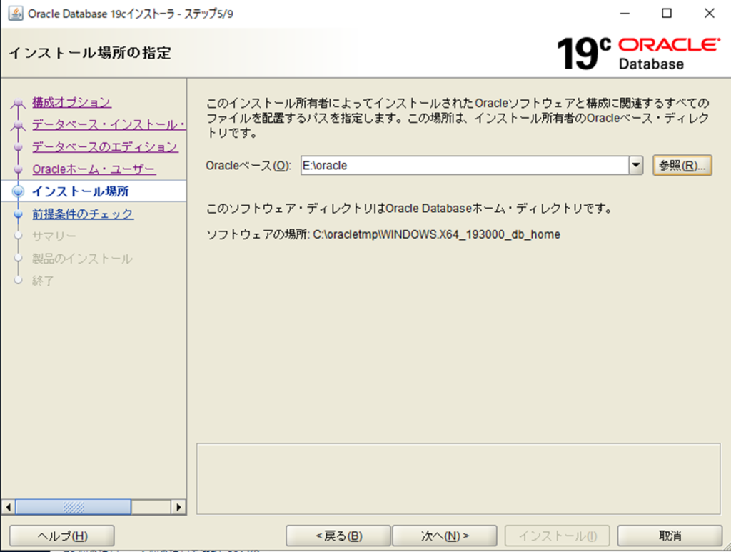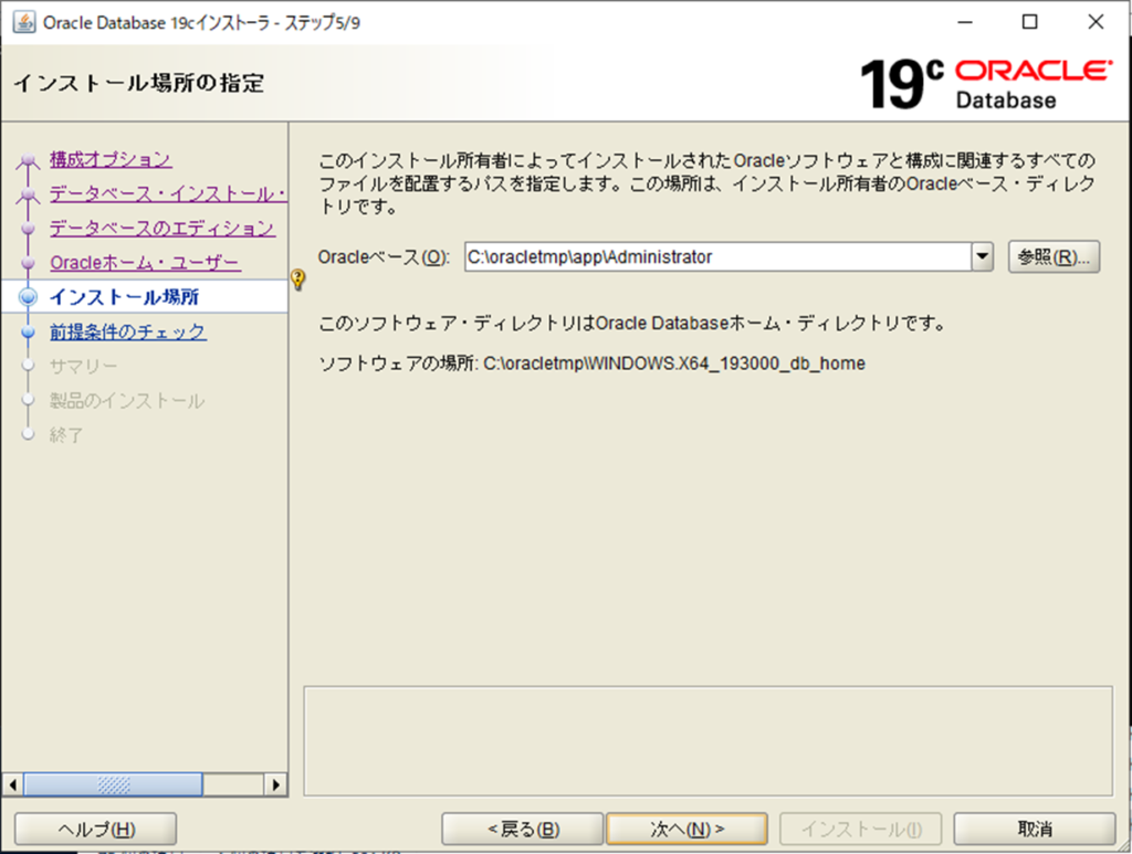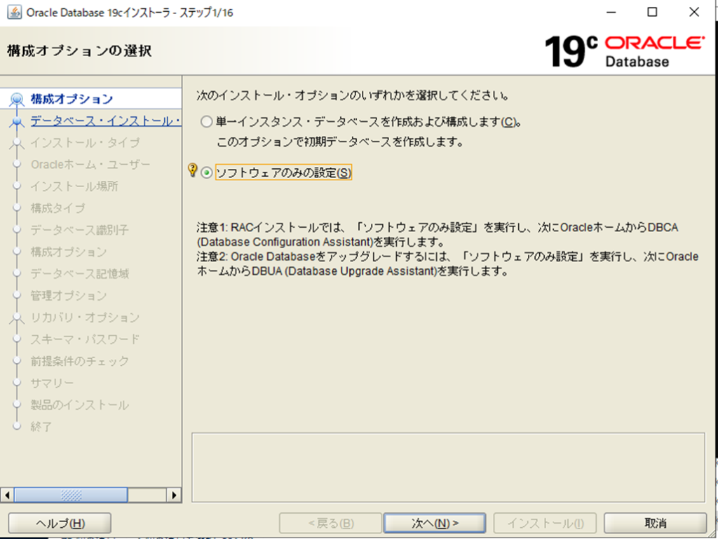 データベースは Database Configuration Assistant (DBCA) で作成するため、「ソフトウェアのみの設定」を選択します。