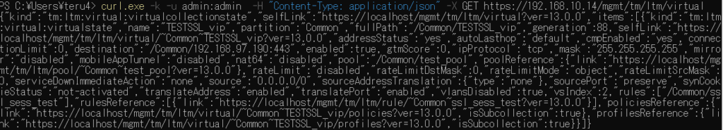 curl.exe -k -u ユーザー:パスワード -H "Content-Type: application/json" -X GET https://IPアドレス/mgmt/tm/ltm/virtual