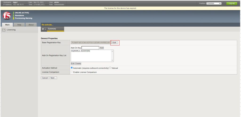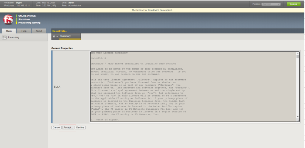 BIG-IP ライセンスのリアクティベート BIG-IP X Facebook はてブ Pocket LINE コピー 2022.11.182023.09.28 アフィリエイト広告を利用しています 「Re-Activate」を押下します。 「Edit」を押しBase Registration Keyを入力し「Next」を押す EULAに同意し「Accept」を押下します。 「Continue」を押下します。