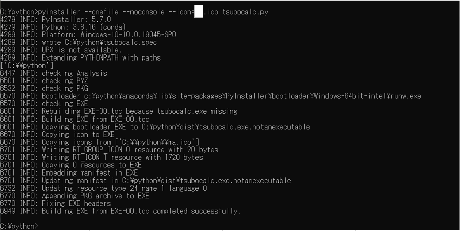 Pythonのexe化でアイコンをつける python X Facebook はてブ Pocket LINE コピー 2023.03.282023.09.28 アフィリエイト広告を利用しています pyinstallerでアイコンを付ける pyinstaller --onefile --noconsole --icon=アイコン名.ico プログラム名.py