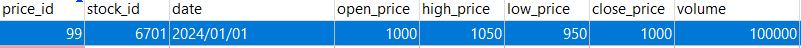 stock_db=# INSERT INTO mstock_price (stock_id, date, open_price, high_price, low_price, close_price, volume) VALUES (6701, ‘2024-01-01’, 1000, 1050, 950, 1000, 100000);